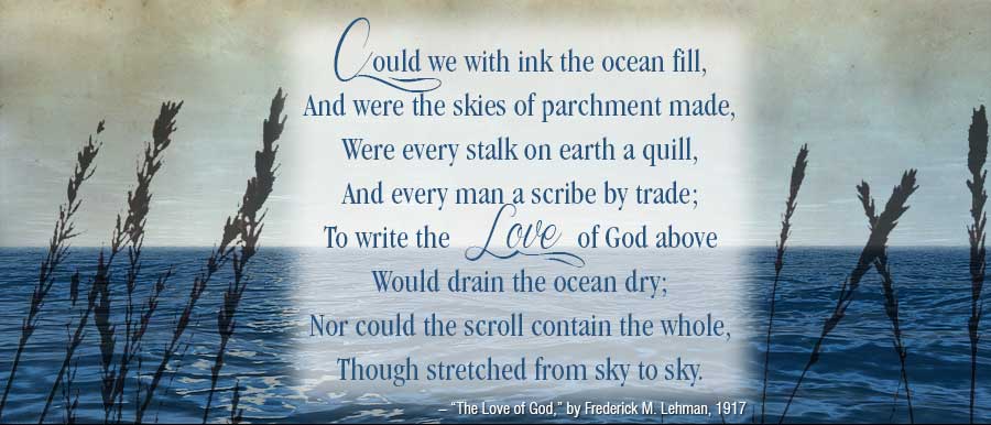We recently sang “The Love of God” (a hymn from 1917 by Frederick M. Lehman) which contains a verse which captures for me brilliantly, poetically, and visually how great the Father’s love for us is. (These Bible verses also do a fairly perfect job of pointing this out: Romans 5:8; 1 John 3:1; John 3:16; 1 John 4:10; Ephesians 2:4; 2 Thessalonians 2:16; etc.)