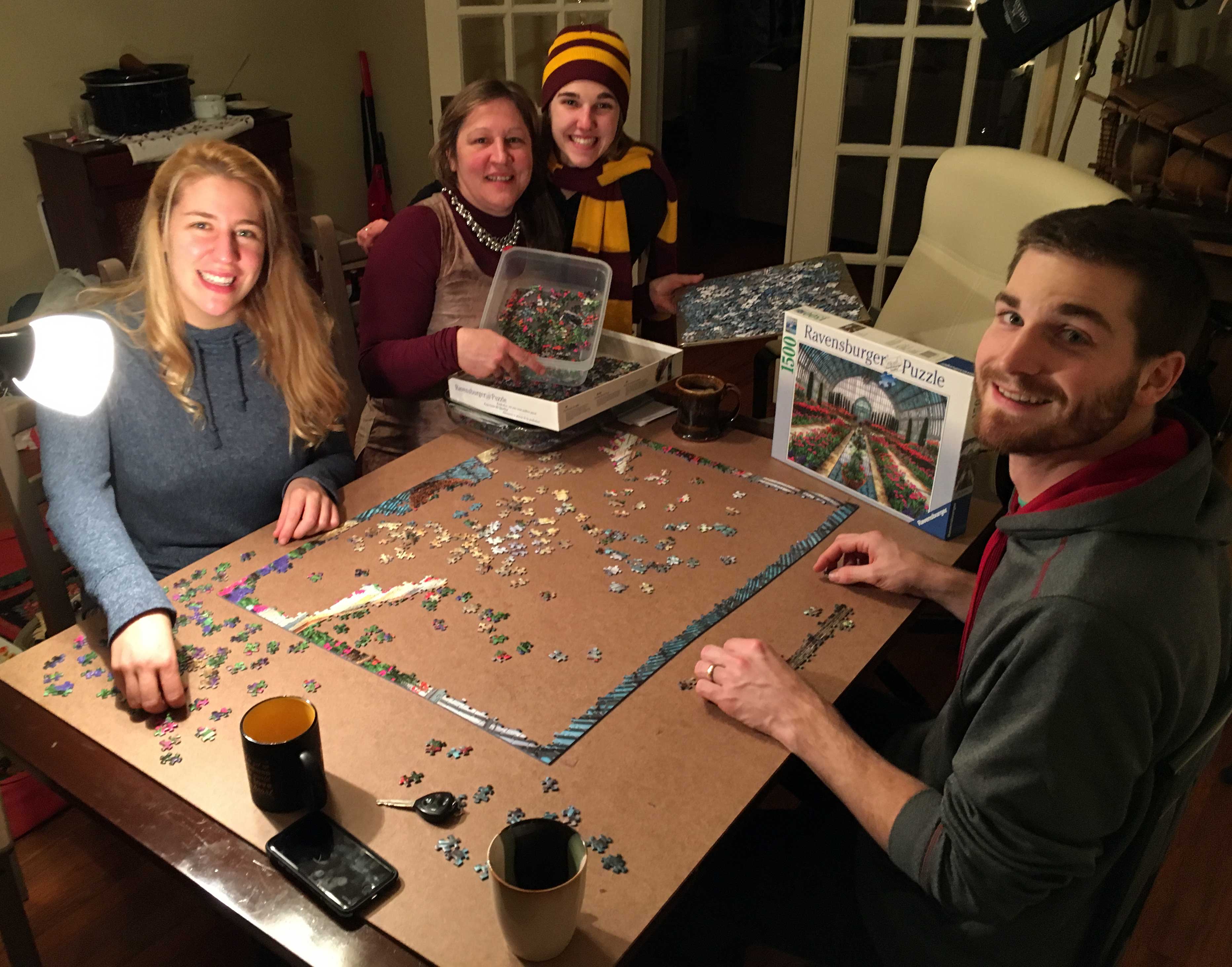 At home, we earnestly dove into our first tradition: a new puzzle. It was a 1,500-piece monstrosity and ultimately remained unfinished when our holiday time was complete. Nevertheless, Judy vowed to finish it when she returns in January for a previously-scheduled visit. We left it on the dining room table to await her arrival, covered by a board so it will remain undisturbed.