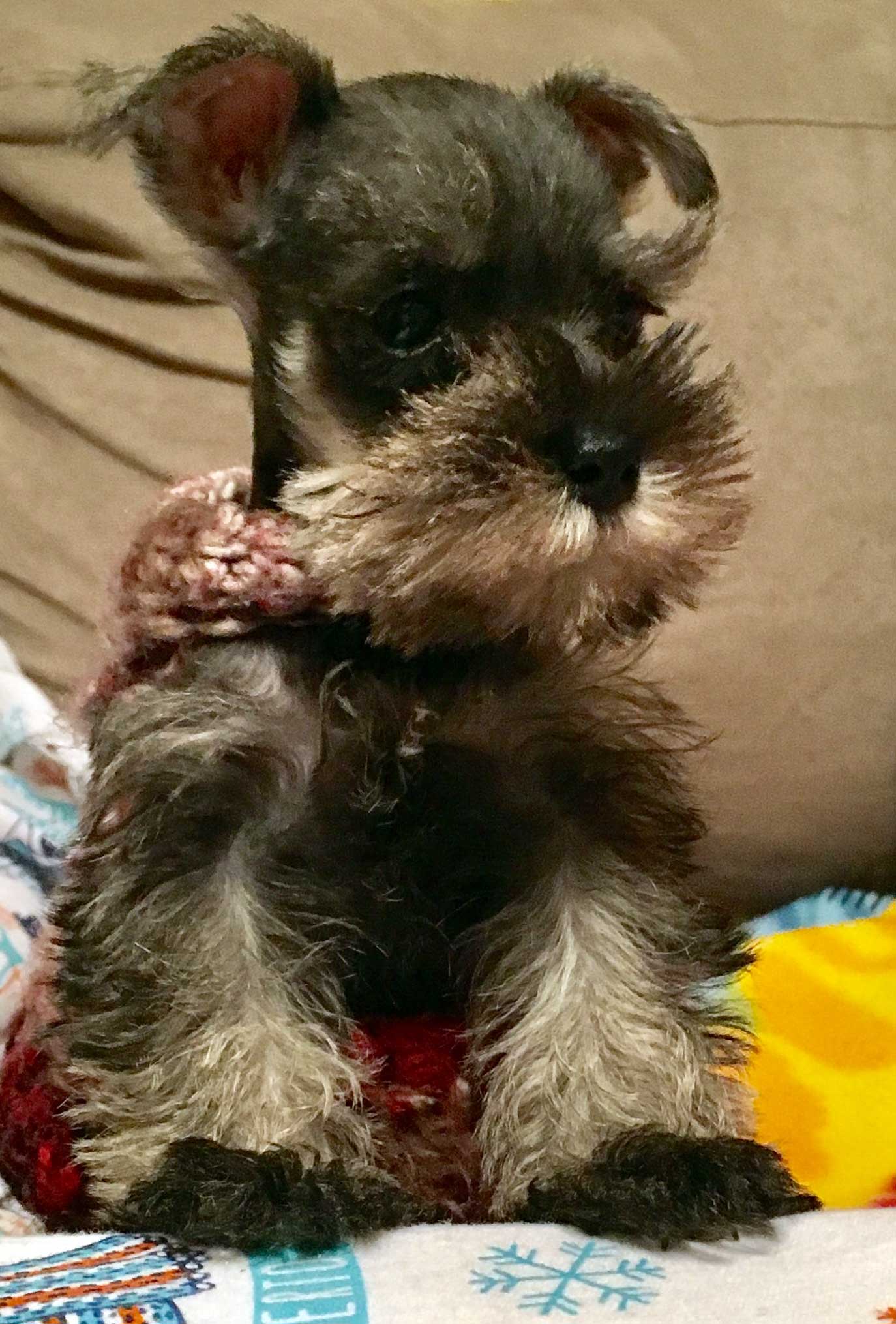 He was gone all night on his errand, and when he returned in the early hours of our “Tuesday as Christmas day” morning, we were just rousing ourselves from “a long winter’s nap.” What we discovered was that his “errand” had actually been a carefully timed and planned rendezvous with a former roommate in Houston (over four hours away, NOT merely down the road in Waco) to pick up a puppy for Elise. He had arranged for Sam to pick up the puppy from a source in Pharr, TX, some five hours from Houston, when he had been visiting Brownsville, TX, only an hour from Pharr. The bottom line was the surprise introduction of Elise to the six-week-old miniature schnauzer of her dreams. She was sleepily shocked by this turn of events and cried out, “Do I get to keep it?”