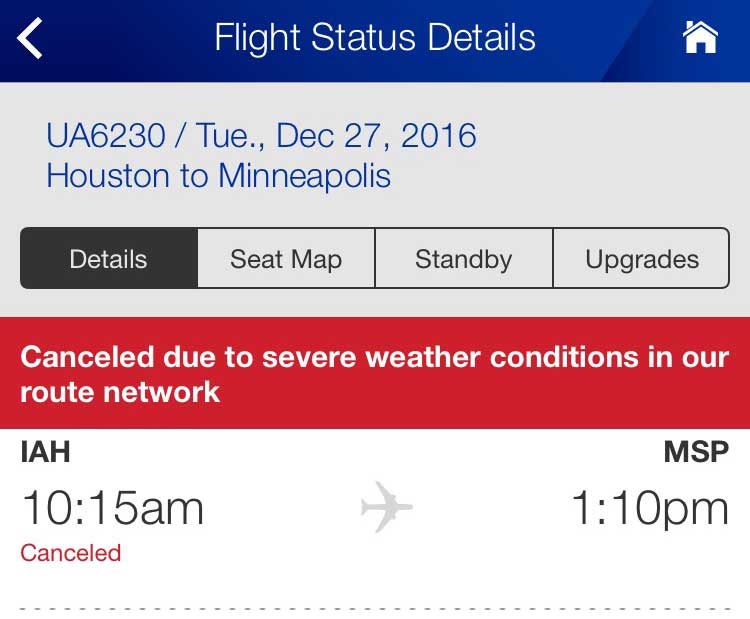 At first they booked us on a flight at 7 am, which connected through Denver. Having once spent an unplanned day in Denver, we requested a direct flight, as our scheduled flight had been. There was a 10:30 flight, to which we agreed, and which we preferred over having to be back at the airport in time to catch a plane by 7 am.